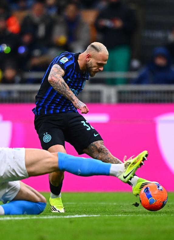 比赛刚刚开打第5分钟,客场作战的那不勒斯就率先制造杀机,霍伊伦的单刀球被索默神勇扑出,随后主裁判也吹罚了霍伊伦越位在先,4分钟之后,国际米兰打破场上平衡,小图拉姆送出助攻,迪马尔科左路小角度抽射建功,帮助蓝黑军团取得了1-0的领先,21-22赛季重返意甲后,迪马尔科已经打进19球,所有后卫中排名第一。